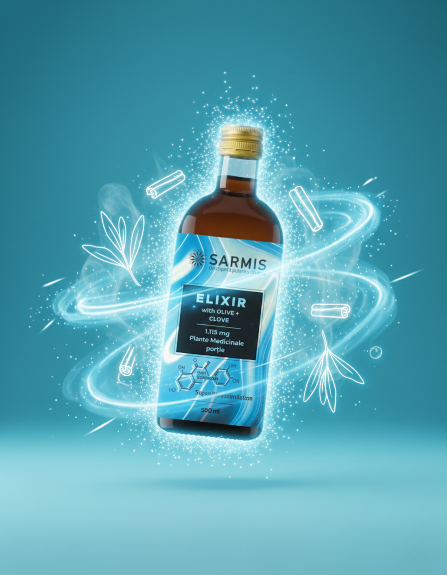 Elixir tonic natural 100% lichid, formulat pentru absorbție rapidă și eficientă, cu accent pe susținerea sănătății generale prin efectele antiinflamatoare și antioxidante ale extractelor de măslin și scorțișoară.