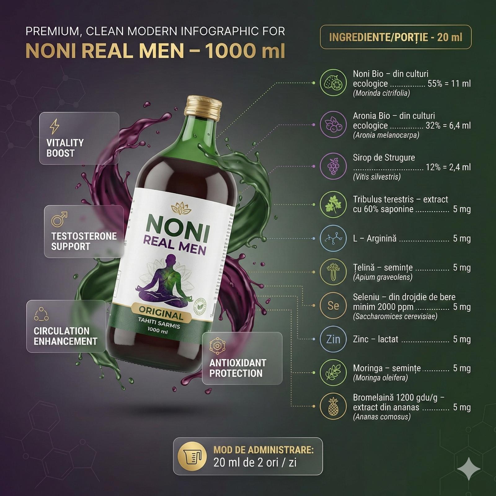Noni Real Men este un supliment lichid de 1 litru formulat special pentru nevoile bărbaților. Combină sucul pur de Noni cu ingrediente care susțin vitalitatea masculină, nivelul de testosteron, performanța fizică și energia. O formulă completă pentru bărbații activi și ambiționați.