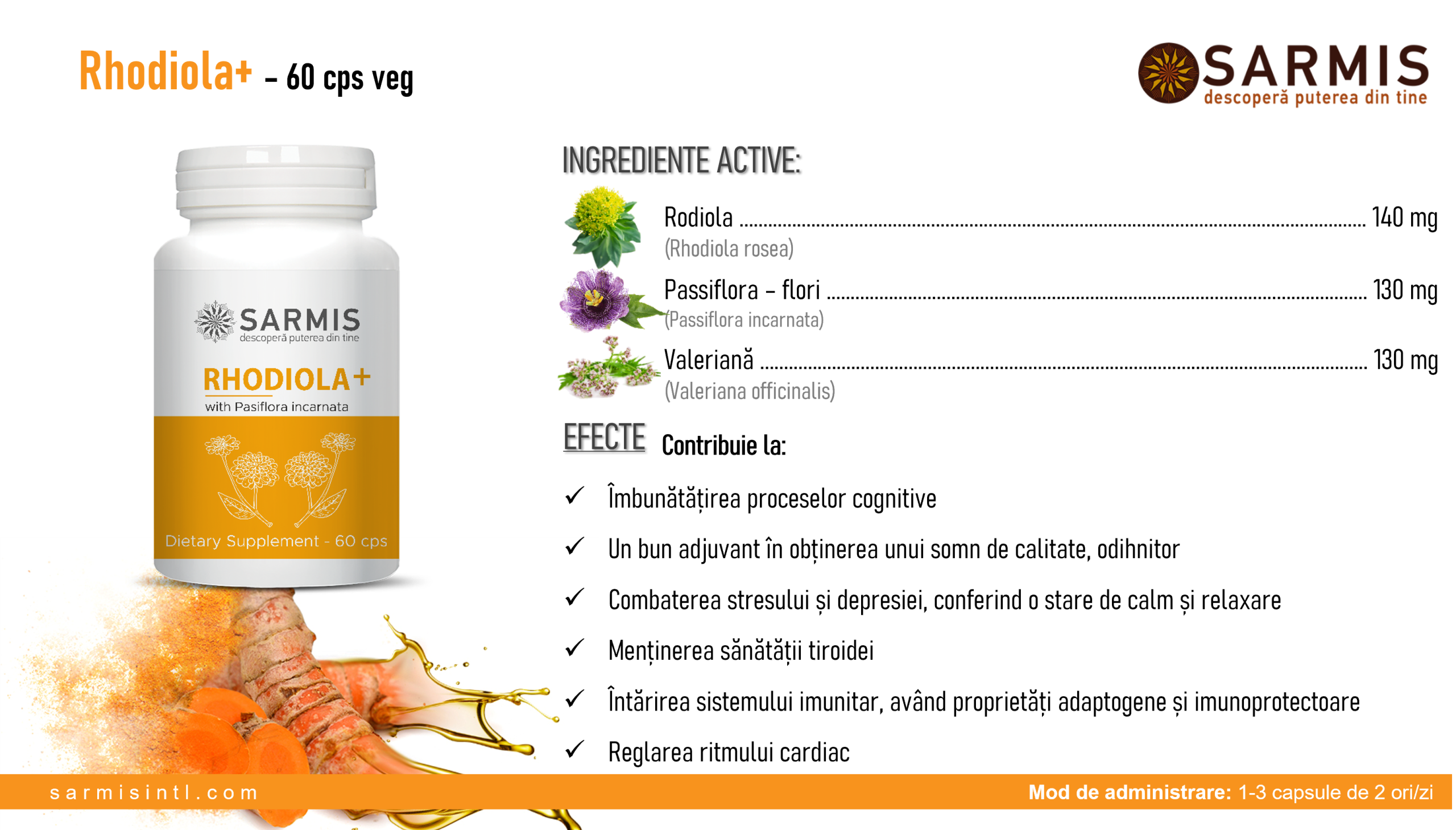 • Rhodiola rosea – sprijină adaptarea organismului la stres, crește rezistența și atenția.